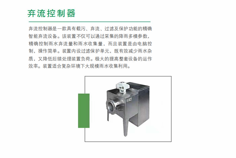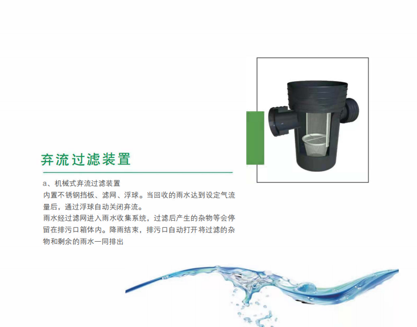 基于我國某些地區(qū)的缺水背景,曼凱倫環(huán)保研發(fā)出一款雨水收集系統(tǒng)。它可收集雨季的雨水,并通過過濾、消毒等處理,使水達到使用標準并儲存起來以供再次利用,從而緩解甚至解決當?shù)氐娜彼畣栴}。從流程上分初期棄流、過濾、儲存、回用四個階段。以下是雨水收集系統(tǒng)的各組件介紹: